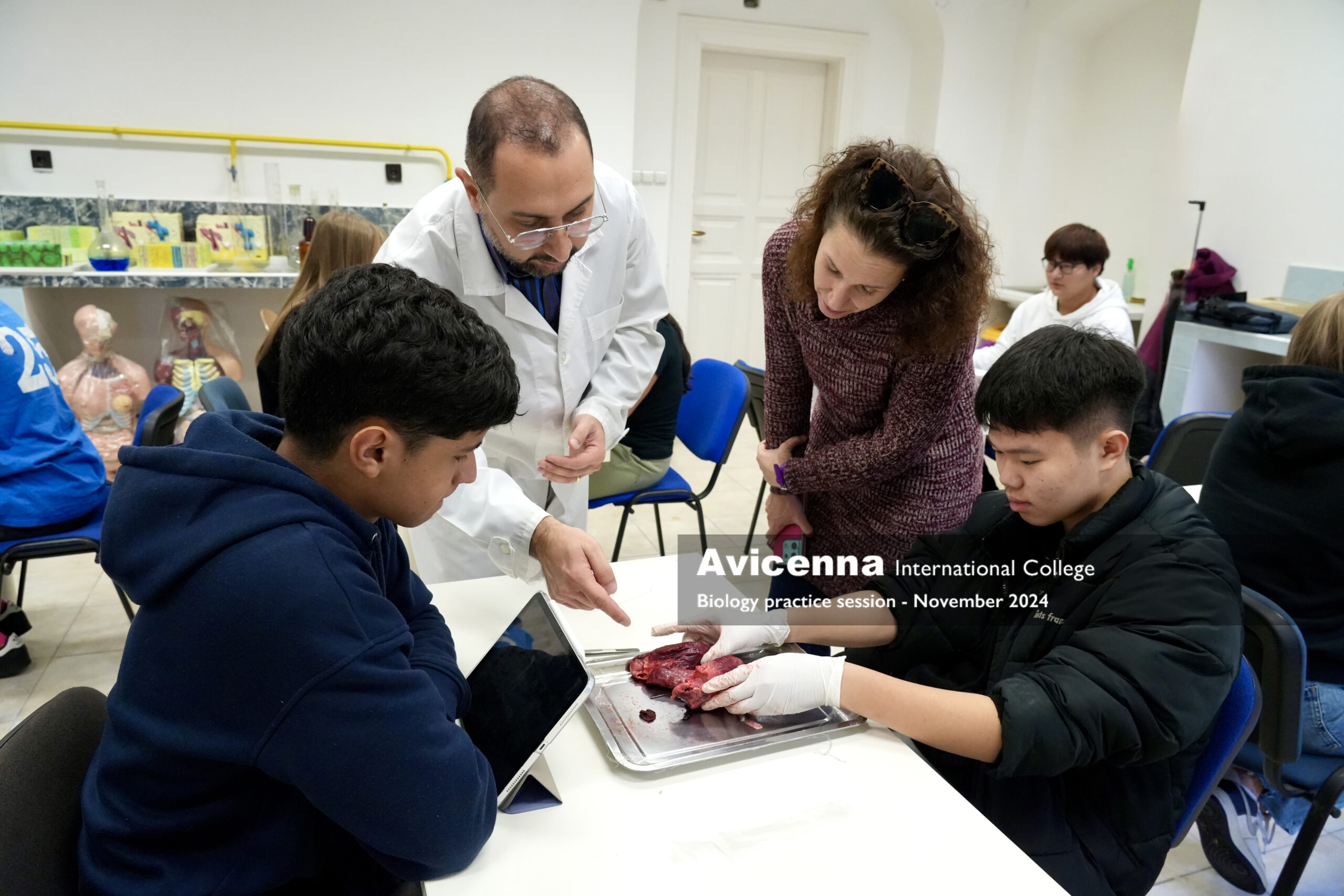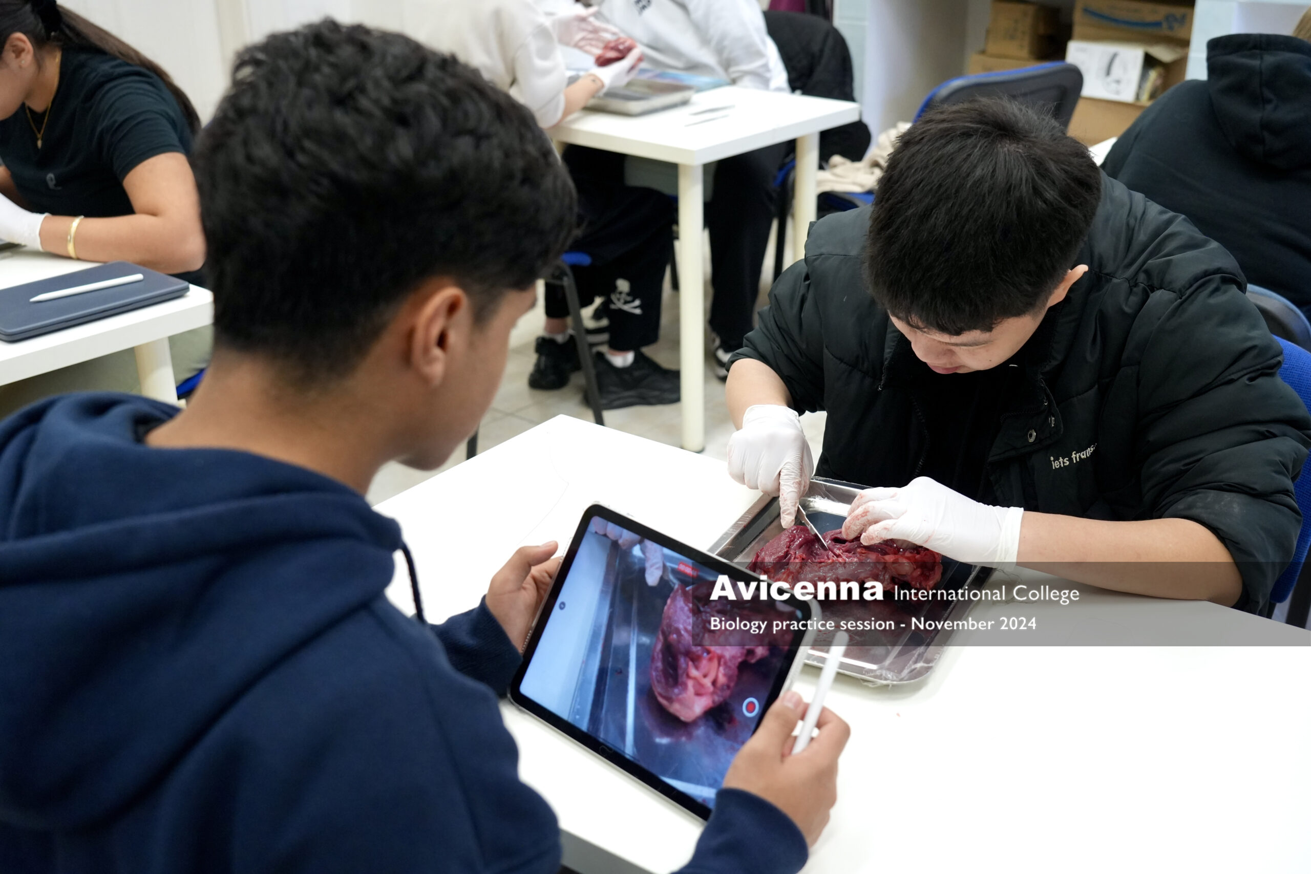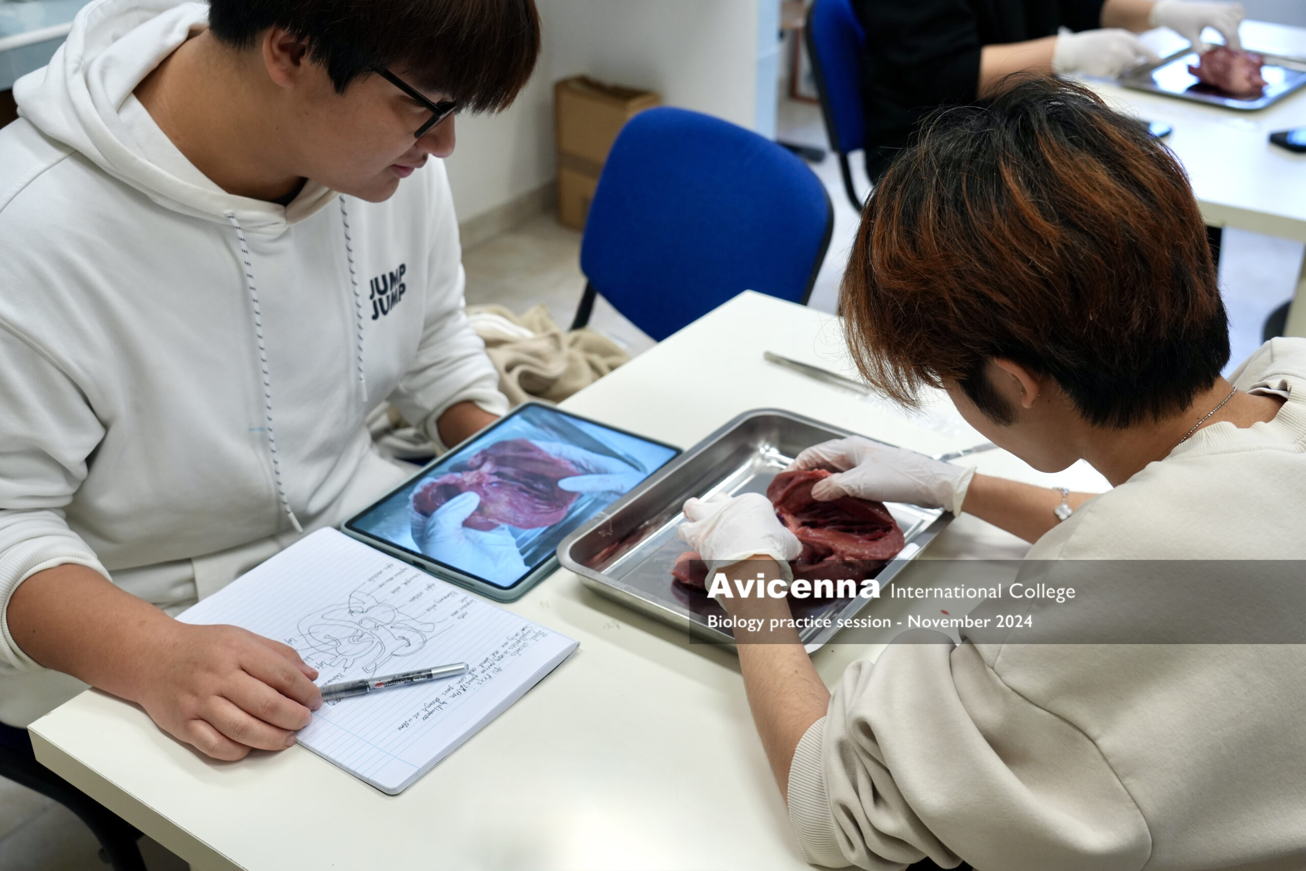 As a part of studying about the cardiovascular system, grade 9 students had a pig’s heart dissection lab session working in pairs. First, they explored the external parts of the heart and learned how to differentiate the right from the left side of the heart along with finding some structures from the outside. Then, they were given instructions to explore and locate the internal structures of the heart from chambers, valves, vessels and tendinous chords. After labelling the main parts what they could see, they were given a little time of free investigation. Students took photos during the session to be used for their lab report which they will need to submit.