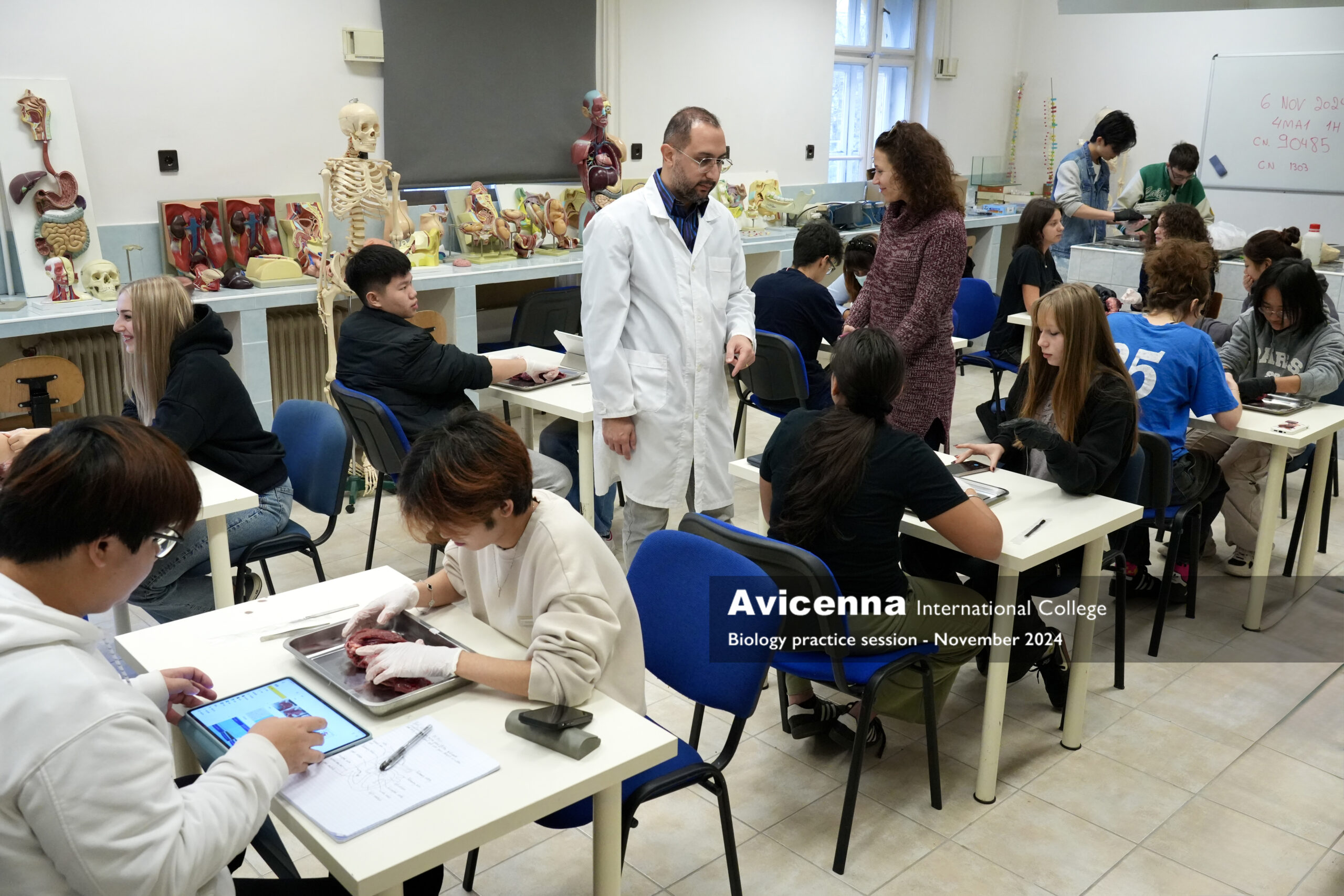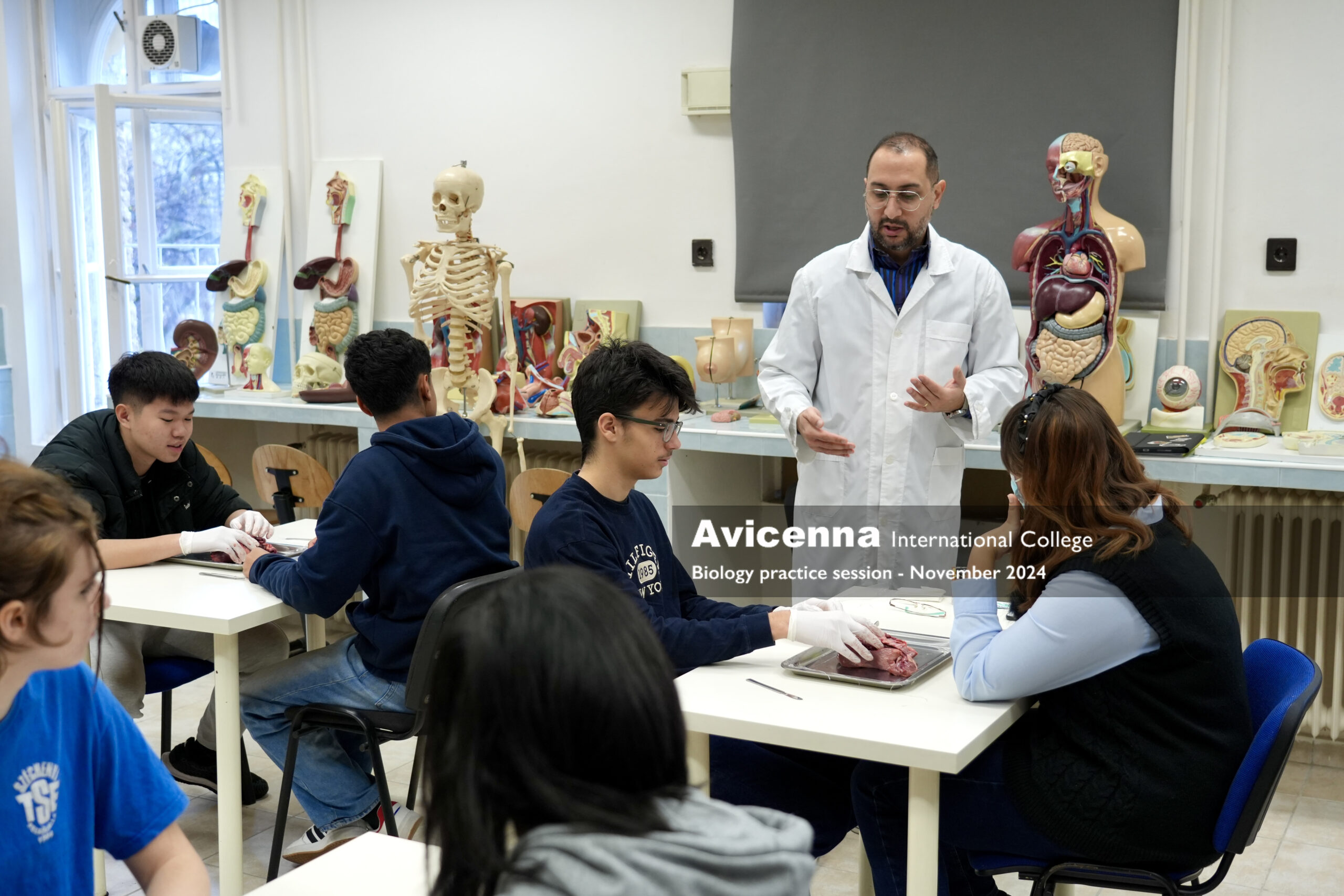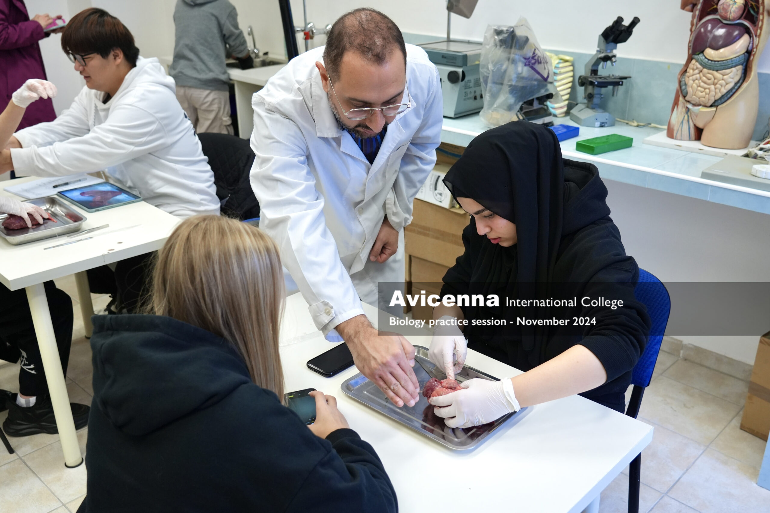 As a part of studying about the cardiovascular system, grade 9 students had a pig’s heart dissection lab session working in pairs. First, they explored the external parts of the heart and learned how to differentiate the right from the left side of the heart along with finding some structures from the outside. Then, they were given instructions to explore and locate the internal structures of the heart from chambers, valves, vessels and tendinous chords. After labelling the main parts what they could see, they were given a little time of free investigation. Students took photos during the session to be used for their lab report which they will need to submit.