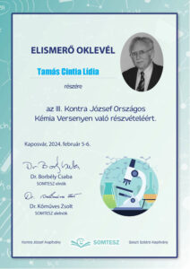 Cintia Tamás, a G9 student, secured the ninth position in the semi-finals of the Kontra József National Chemistry Competition. The two rounds of the competition featured calculation problems with varying levels of general chemical knowledge and theoretical questions requiring deeper understanding. Although only the top five participants will advance to the finals, we are not disappointed and are looking forward to next year competition with renewed enthusiasm
